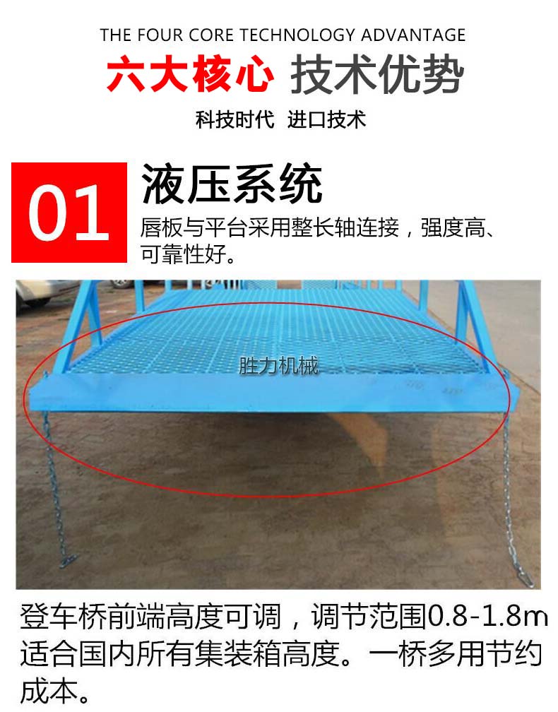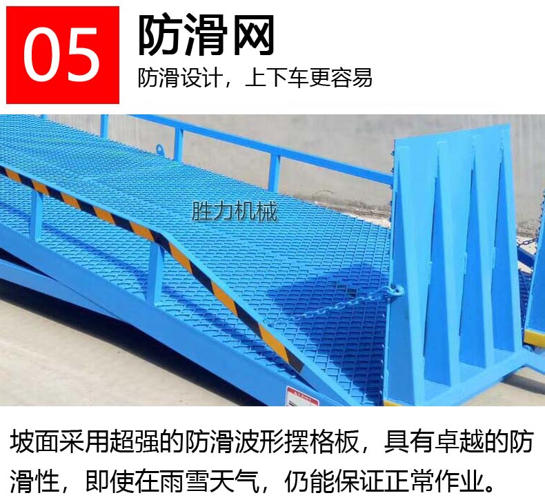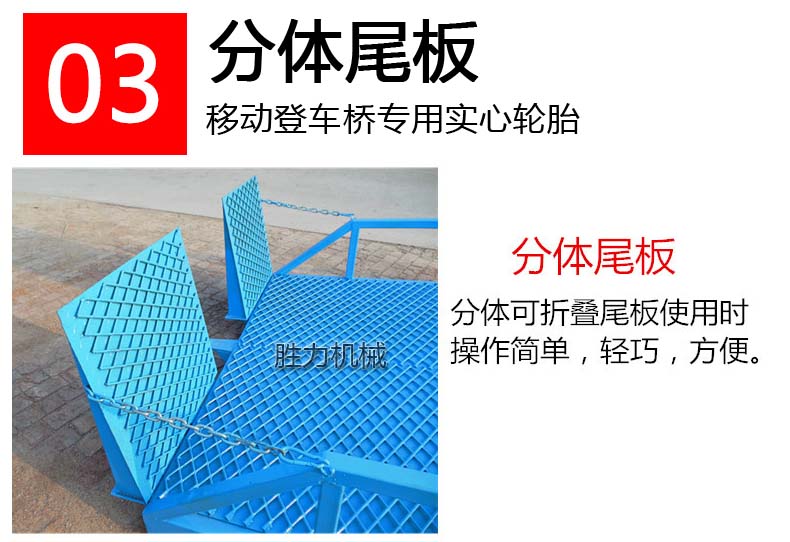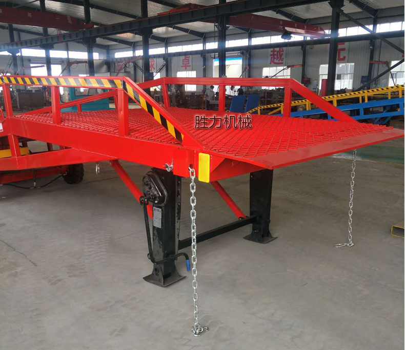 移动登车桥也被称作叉车装卸专用平台,是装卸货物的专用液压设备,设备带有移动轮,可随时移动到装卸地点。移动登车桥根据额定载重量可分为6吨、8吨、10吨、12吨、15吨,设备总长11米,带有坡度,叉车等搬运车辆可通过移动登车桥的坡度和高度直接驶入货车内部进行装卸货物作业,在提高装卸作业效率的同时又能充分保障作业安全。移动登车桥无需外接电源,可通过手压泵做动力进行能设备高度的调整,可以充分适应各种不同高度的货车。移动登车桥加快装卸货物的速度,减少劳动力,为企业获取更大的经济效益。