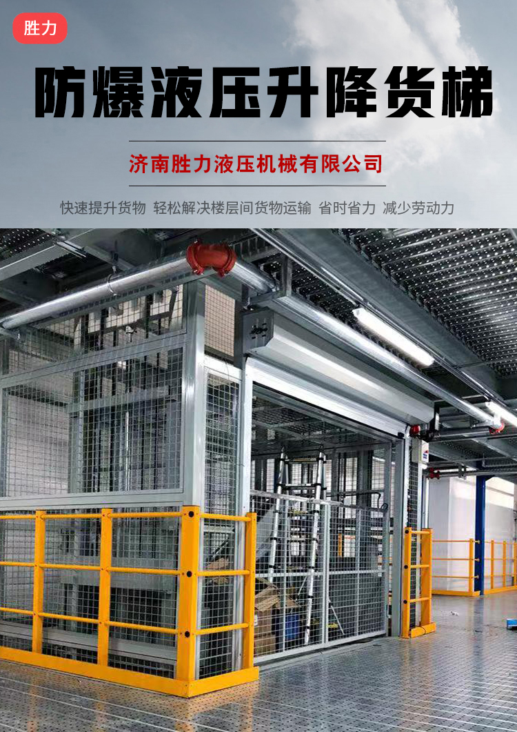 防爆液压升降货梯是一种由导轨、链条、油缸、液压泵站、电控系统组合而成的液压升降平台,因此也可以称为导轨式升降作业平台,其主要用途是把货物运送到不同的楼层,是替代传统电梯的理想提升平台设备,防爆液压升降货梯大多用于化工厂、制药厂、煤矿等需要防爆的企业。 防爆液压升降货梯的防爆等级大多为ExdIIBT4,也可根据客户要求定制其他防爆等级。