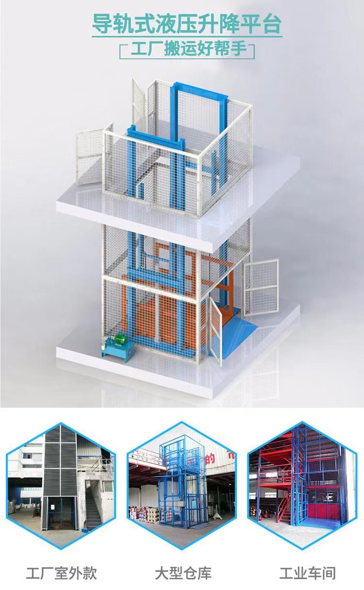 工厂液压升降货梯是一种用于工厂物料、成品等货物的液压升降机平台,平台采用液压油缸做动力,通过重型链条和防坠钢丝绳传动,确保平台运行安全,因此也被称作导轨式升降作业平台,此款设备在2015年开始不再属于特种设备,工厂安装时也无需向当地有关部门备案验收。