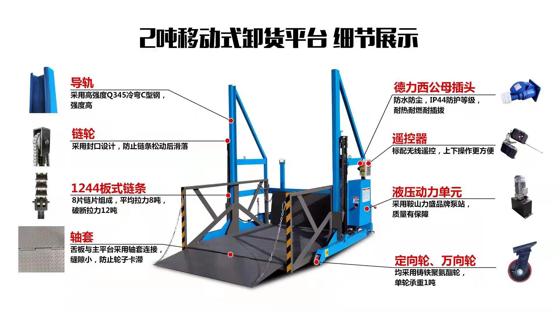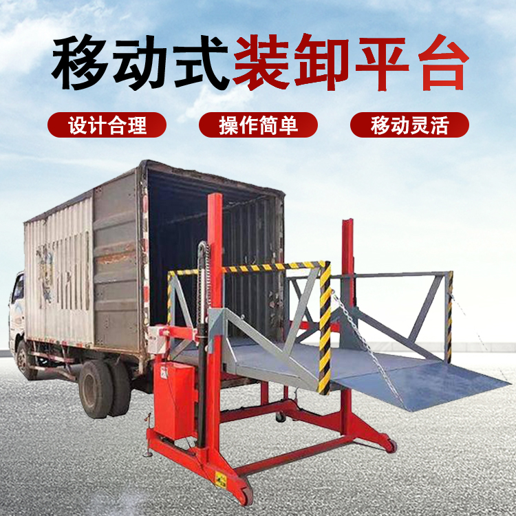 卸货柜设备也可以叫做升降式卸货平台,属于可移动升降平台。卸货柜设备拥有移动灵活,升降平稳的特点。被广泛应用于集装箱与叉车等搬运车辆配套进行货物的快速装卸等。卸货柜平台的操作简单,把平台移动至需要装卸货物的车辆尾部,把叉车等货物放入工作台面上,一人通过无线遥控或工作台面上的按钮即可轻松把叉车等货物升高至与车尾同等高度,使叉车与货物轻松快速的驶入车厢内部。
