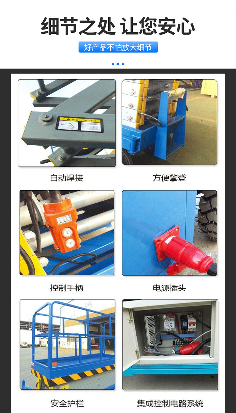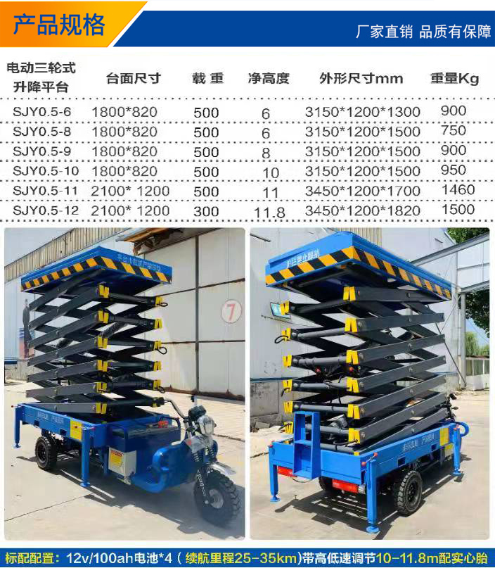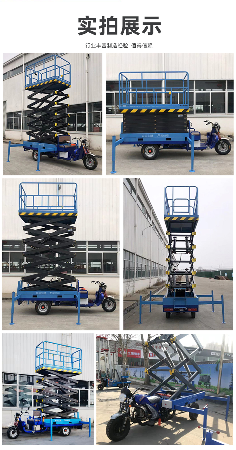 三轮车升降平台剪叉式机械结构,使升降机起升后有较高的稳定性。宽大的作业平台和较高的承载能力,使高空作业范围更大、并适合多人同时作业。移动剪叉式升降机具有移动灵活、升降平稳、操作方便、载重量大等特点,被广泛用于工厂、车间、机场、园林、车站、路灯维修、高速公路及建筑装修等各种高空作业场所。